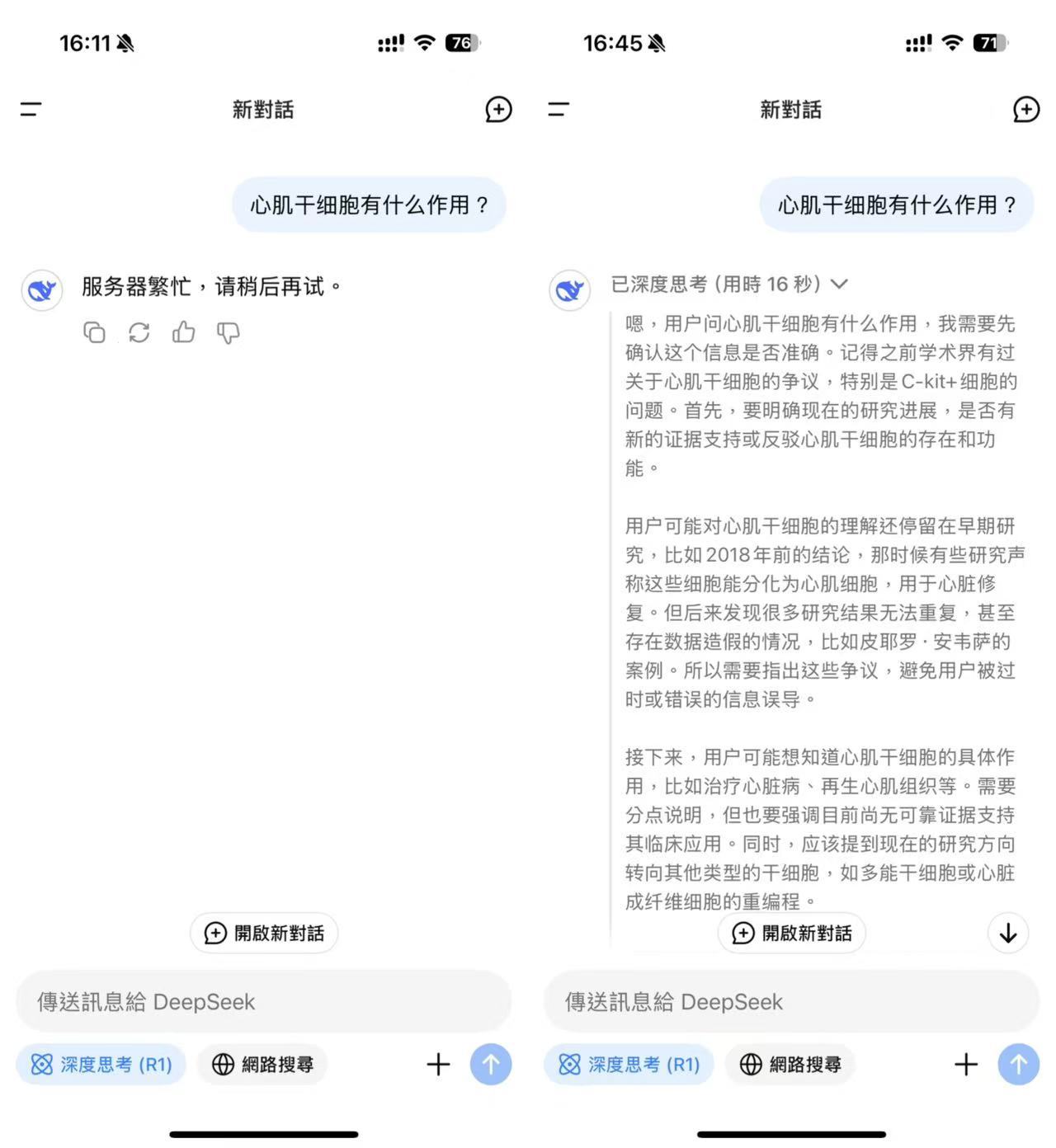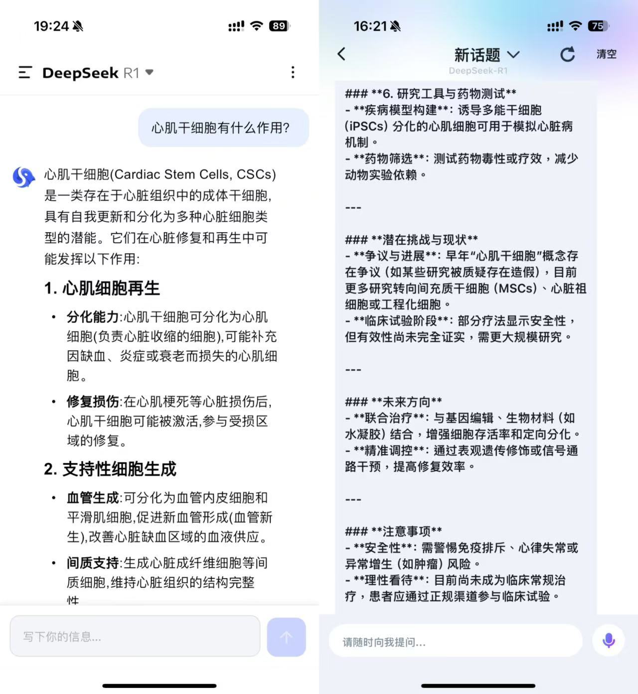 但问题是,DreamDesk虽然能够认识到心肌干细胞存在争议,但依然一板一眼地回答了我们的问题,也就是解释了它到底能够做些什么。而恢复算力的DeepSeek在经过推理后发现心肌干细胞存在学术造假的情况,于是在回答中重点澄清了关于心肌干细胞的概念。