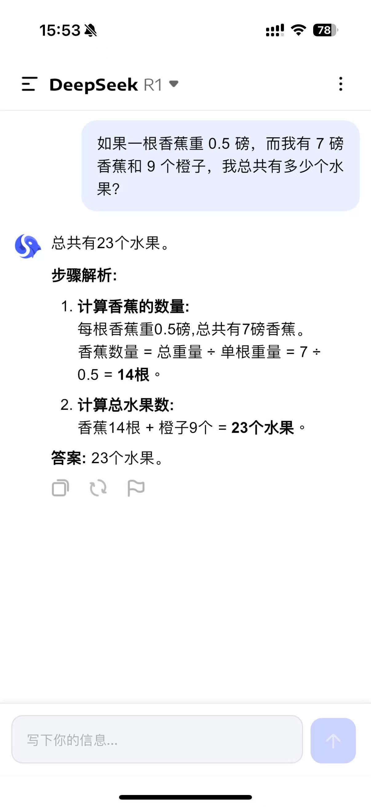 在2023年末,主流AI大模型还会将这个问题简单直接作答“23个”或直接回答错误,而我们都知道,DeepSeek-R1之所以能够爆火全球,主要还是其低成本的蒸馏算法与强悍的推理能力。那么我们就来看看,它们在推理能力上表现如何。