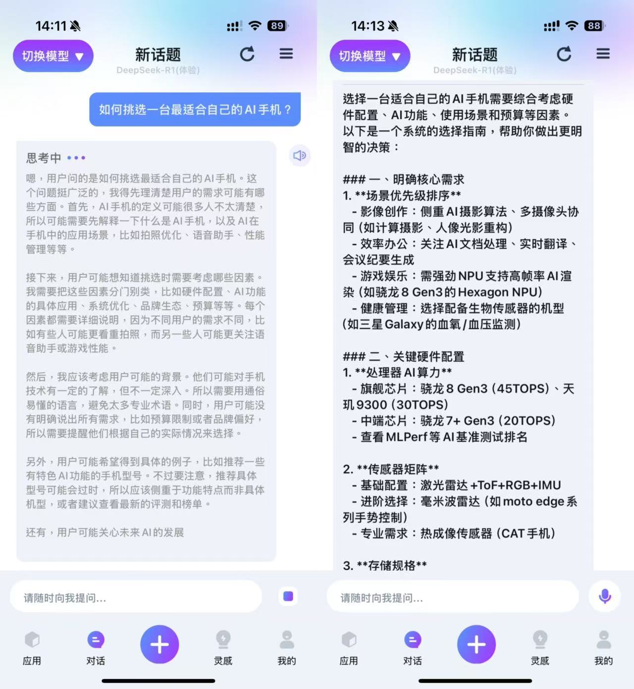 为了测试DreamDesk到底有没有撒谎,我们还是先尝试询问了它两个简单的问题。首先我们询问了DreamDesk“如何挑选一台AI手机”,DreamDesk展示了完整的思维链,也给出了一份相当详细的推荐指南,表现不错。