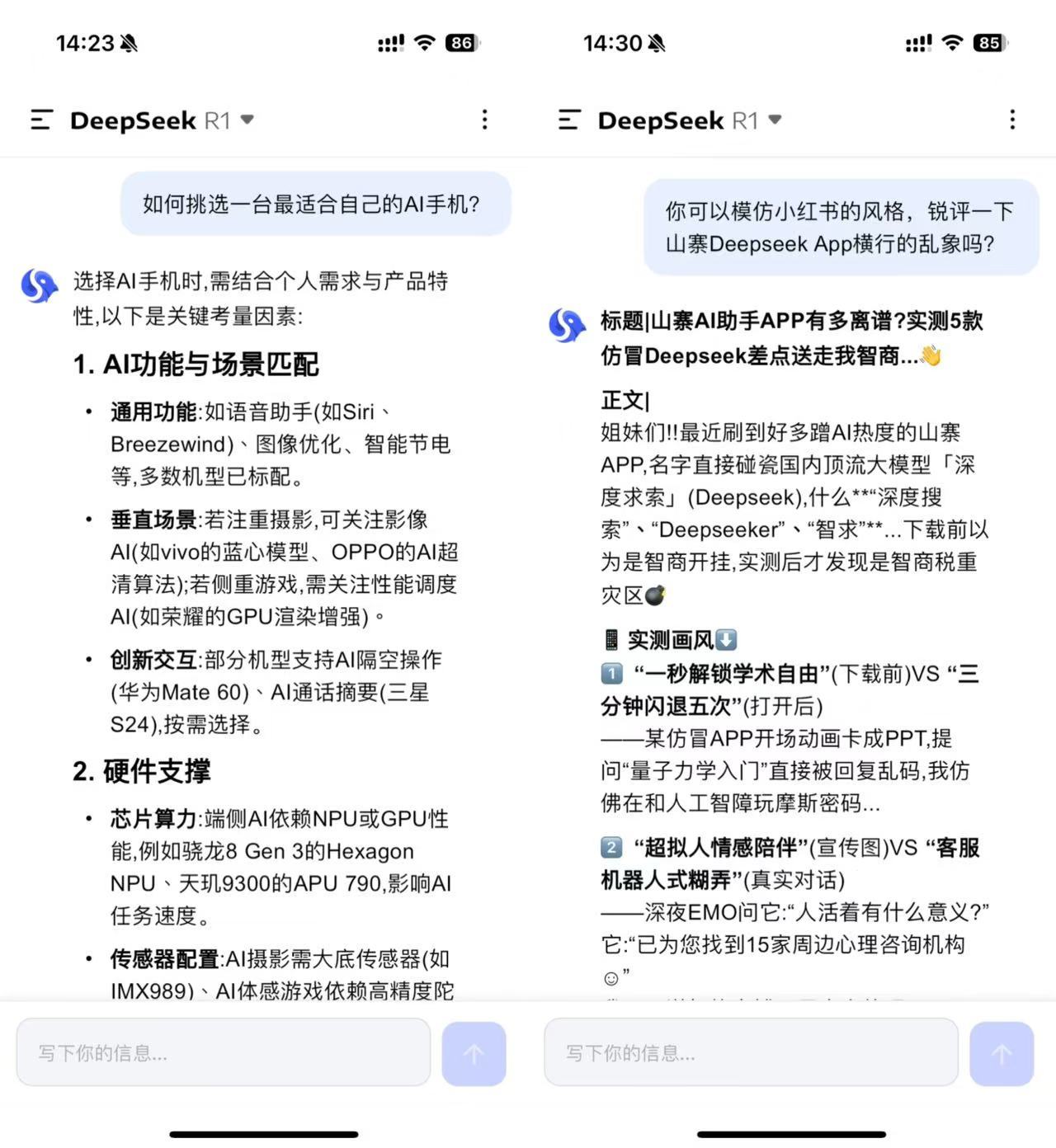 收费贵其实并不是AI Seek唯一的槽点,它最大的问题是模型欺骗。我们尝试用前面问DeepSeek的那两个问题问AI Seek,一个是如何挑选AI手机,另一个则是用小红书的风格锐评山寨DeepSeek乱象。结果AI Seek虽然宣称使用的DeepSeek-R1模型,却根本没有思维链。
