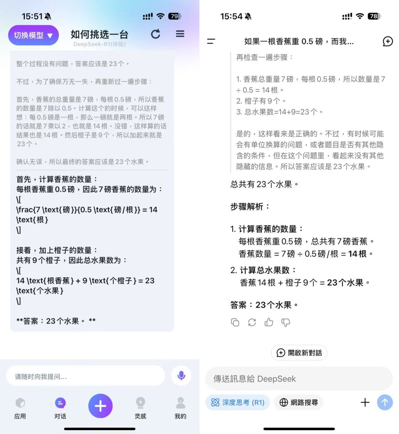 DeepSeek和DreamDesk使用的都是标准DeepSeek-R1模型,因此它给出了漫长的思辨过程,对香蕉重量、总共水果重量等条件分类推理。另外,DeepSeek-R1还会反思自己的思考过程,在其中找出不同的可能性。