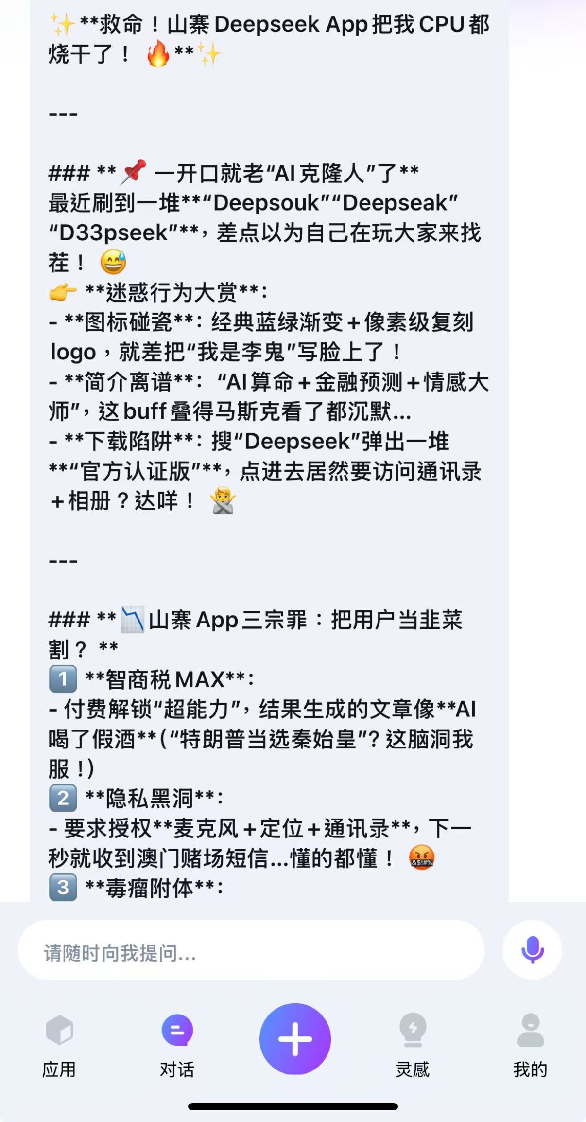 体验下来,这些打着DeepSeek名号的AI大模型们,可能很难构成传统意义上的「山寨」App。毕竟它们真的接入了DeepSeek大模型,也真的利用这个大模型帮助我们解决问题。