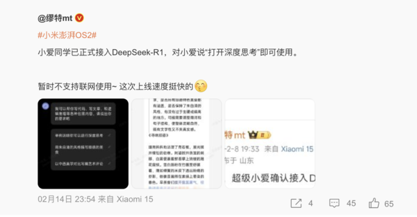 小米官方尚未说明在哪些机型中加入DeepSeek-R1模型,然而根据多名网友实测结果来看,所有支持升级到超级小爱的机型,都能接入DeepSeek-R1模型。