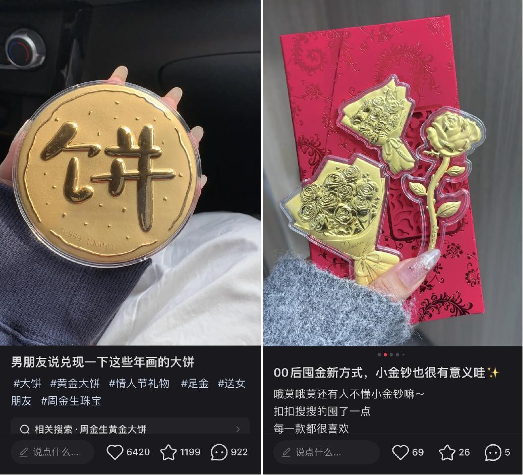 老庙黄金相关负责人认为,年轻人除了看重黄金的实用与保值功能,还希望通过金饰满足礼赠、悦己的需要,比如今年情人节,从品牌的评论区可以发现,除了情侣送礼,很多女性也会给自己买节日礼物。
