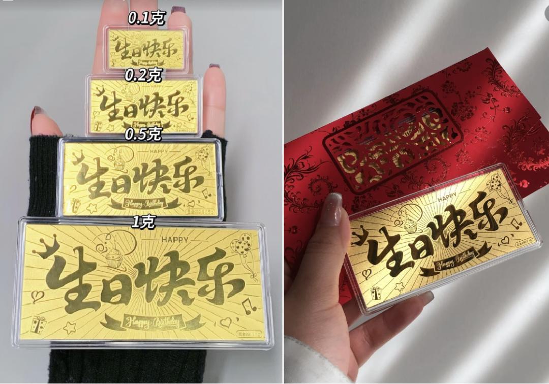 黄金生产工艺的迭代,也为小克重产品的形态赋予了更多想象力。胡润梧拿一款“生日快乐”金钞举例,用机器压到极薄,再用模具热压成型,最后裁边修饰,相比过去的手工制作,这种薄片金钞可以在同克重前提下将尺寸做得更大,再搭配传统红包的包装,富贵又讨喜。
