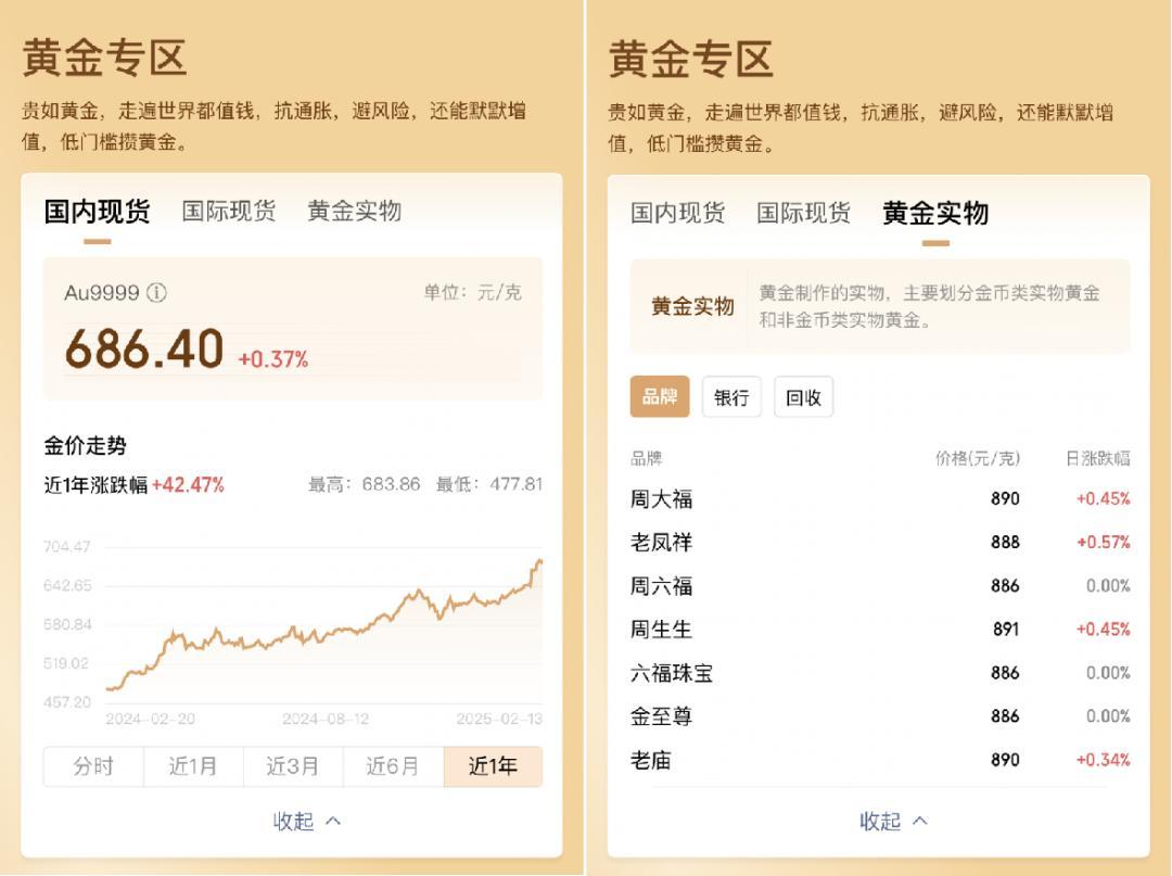 2025开年以来,国内黄金价格猛涨,频创历史新高。截至2月13日,国内现货金价达到686元/克,周大福、老凤祥等品牌的黄金实物克价达到890元/克、880元/克。