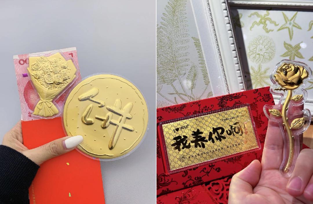 在淘宝天猫平台上,黄金玫瑰成为新一代“浪漫永生花”,2月环比成交增长超300%;可定制姓名的黄金圆饼,让“画饼”变得诚意十足,成交环比增长超1500%;足金打造的“听话符”,化身恋人的社交货币,在节前卖脱销;52克的爱心金块,几天内热卖700多万元......