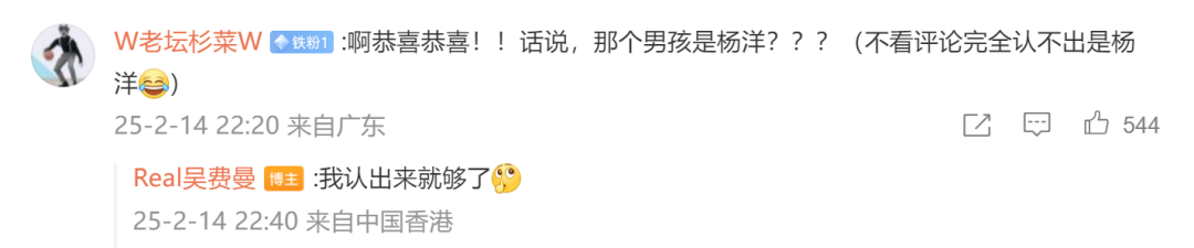 2月14日晚,曾参与录制第二季《爸爸去哪儿》的吴镇宇儿子吴费曼在个人社媒晒出与杨威儿子杨阳洋的合照,并发文称:“今年情人节不再孤独,与‘特别的人’吃烛光晚餐”。