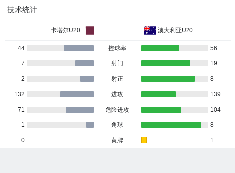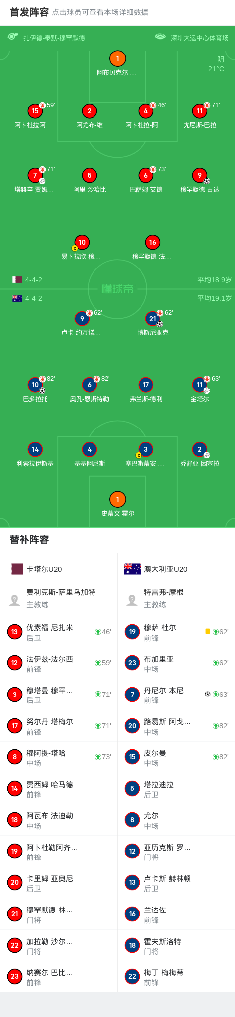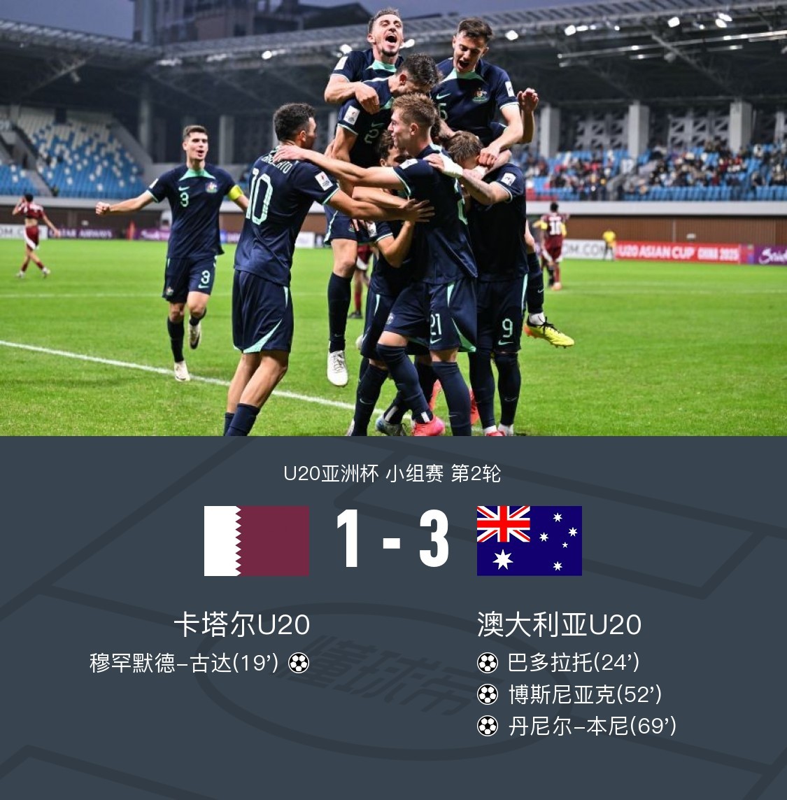 北京时间2月15日U20亚洲杯 小组赛 第2轮,卡塔尔U20对阵澳大利亚U20。卡塔尔U20穆罕默德-古达破门。澳大利亚U20巴多拉托破门,博斯尼亚克破门,丹尼尔-本尼破门。最终比分卡塔尔U20 1-3 澳大利亚U20。