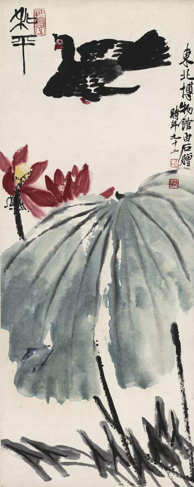 离家远游,总免不了有离乡之愁,齐白石的不少诗是倾诉自己漂旅生涯、思乡之愁的。在一幅《芦雁图》上他题五言诗:“容易又秋风,年年别复逢。雁鸣休笑我,身世与君同。余年来尝居燕京,春往秋归,画此慨然题句。”画家在这里感慨自己跟芦雁一样,如候鸟般地漂泊。在另一幅中国美术馆藏《芦雁图》上齐白石题七言诗一首:“登高时近倍思乡,饮酒簪花更断肠。寄语南飞天上雁,心随君侣到星塘。”画家登高想到家乡,盼望南飞的大雁,能够捎带上自己的心回到星塘老屋,可谓思乡情切。