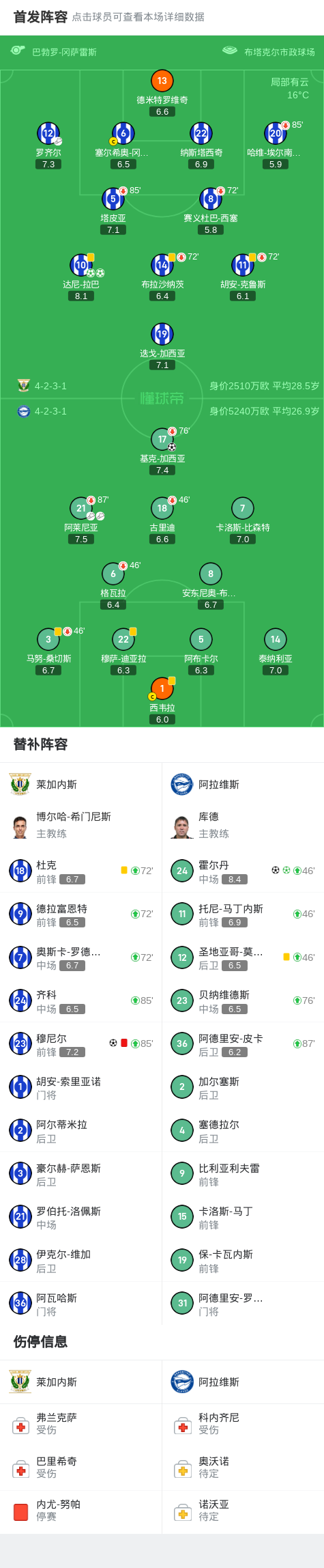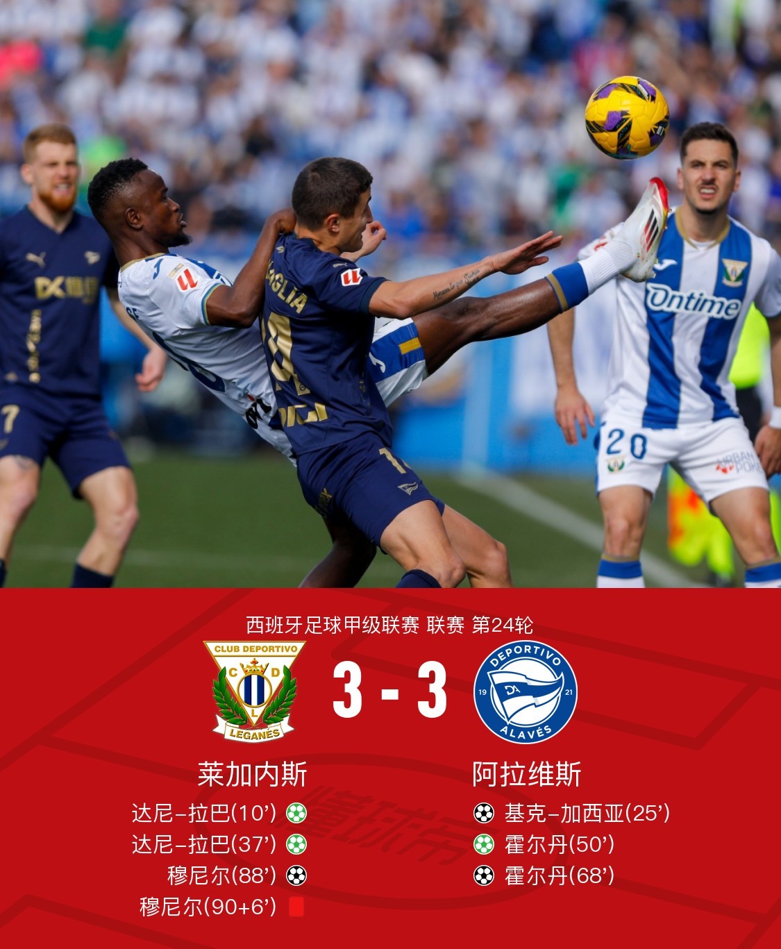 北京时间2月15日西班牙足球甲级联赛第24轮,莱加内斯主场对阵阿拉维斯。莱加内斯达尼-拉巴点射梅开二度,穆尼尔破门。阿拉维斯基克-加西亚破门,霍尔丹双响。最终比分莱加内斯3-3阿拉维斯。