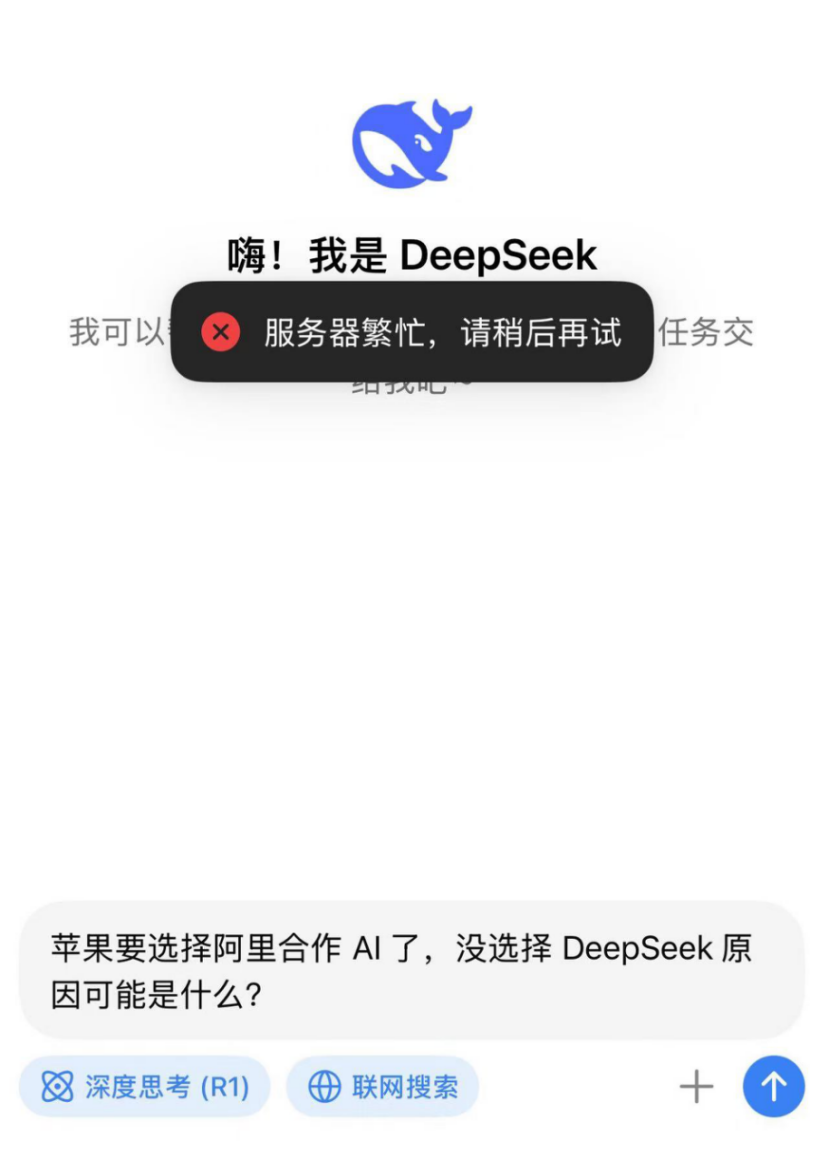 据字母榜实际测试,目前如果选择深度思考和联网搜索模式,DeepSeek会直接以弹窗形式发送一条“服务器繁忙,请稍后重试”的提醒,而不再像以往那样在对话框中给予回复。