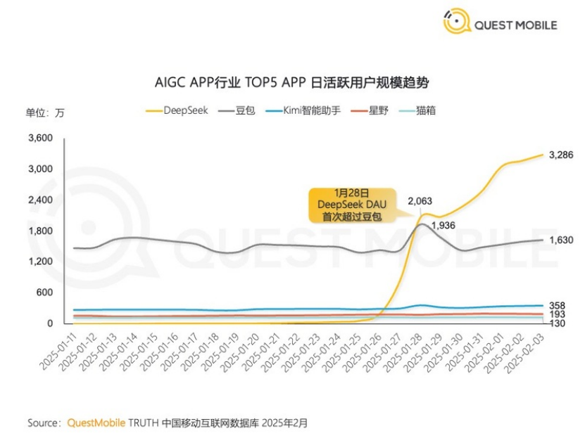 近期,QuestMobile给出的数据显示,DeepSeek日活跃用户(DAU)在1月28日首次超越豆包(约1695万),随后在2月1日突破3000万大关,成为国内DAU最高的AI 对话产品。做到这一切,DeepSeek只用了20天。