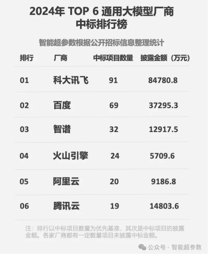 招投标市场的公开信息也佐证着这一点。根据第三方机构智能超参数最新发布的《中国大模型中标项目监测报告(2024)》,2024 年,在通用大模型厂商中标排行榜中,前五名几乎全部来自AI大厂。其中,科大讯飞更是以91个中标项目、披露中标金额84780.8万元排名第一,成为2024年度标王。
