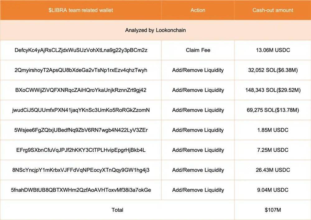截至中午12时,据 Lookonchain 监测,与 LIBRA 团队相关的 8 个钱包通过增加流动性、移除流动性和索取费用获得了 5760 万枚 USDC 和 249,671 枚 SOL(约合 4970 万美元),共计套现约 1.07 亿美元。