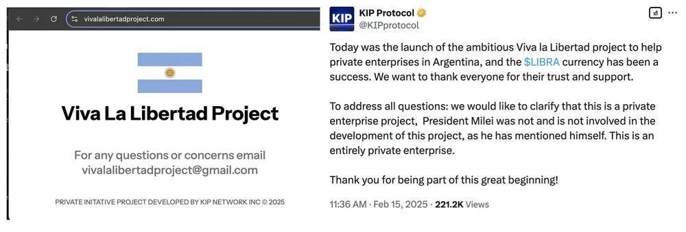 更离谱的是,竟然有项目真的站出来认领了 LIBRA 发币。Viva la Libertad 项目官网显示该项目是一个由 KIP Protocol 开发的私人独立项目。