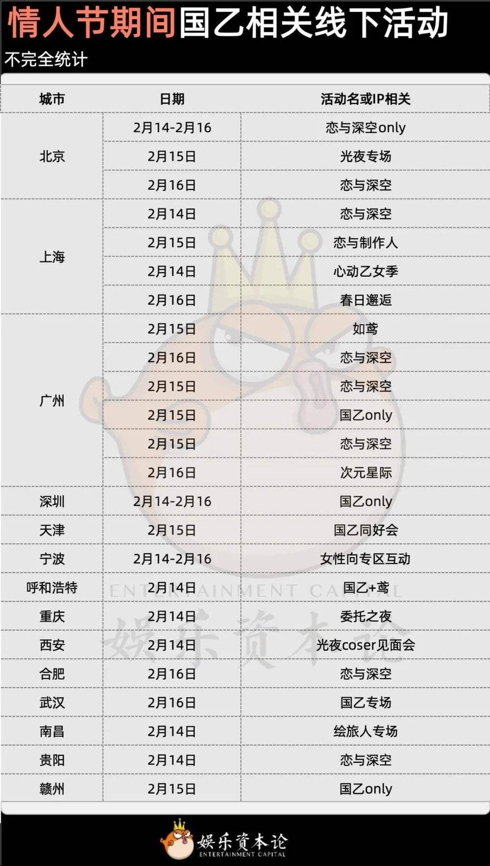娱乐资本论发现,虽然玩家在情人节卡池氪金决策变得审慎了,但她们并不是不给国乙产品花钱了。相反,根据不完全统计,今年情人节全国多个城市在本周末有几十场国乙only活动,这几天的cos委托也很紧俏。