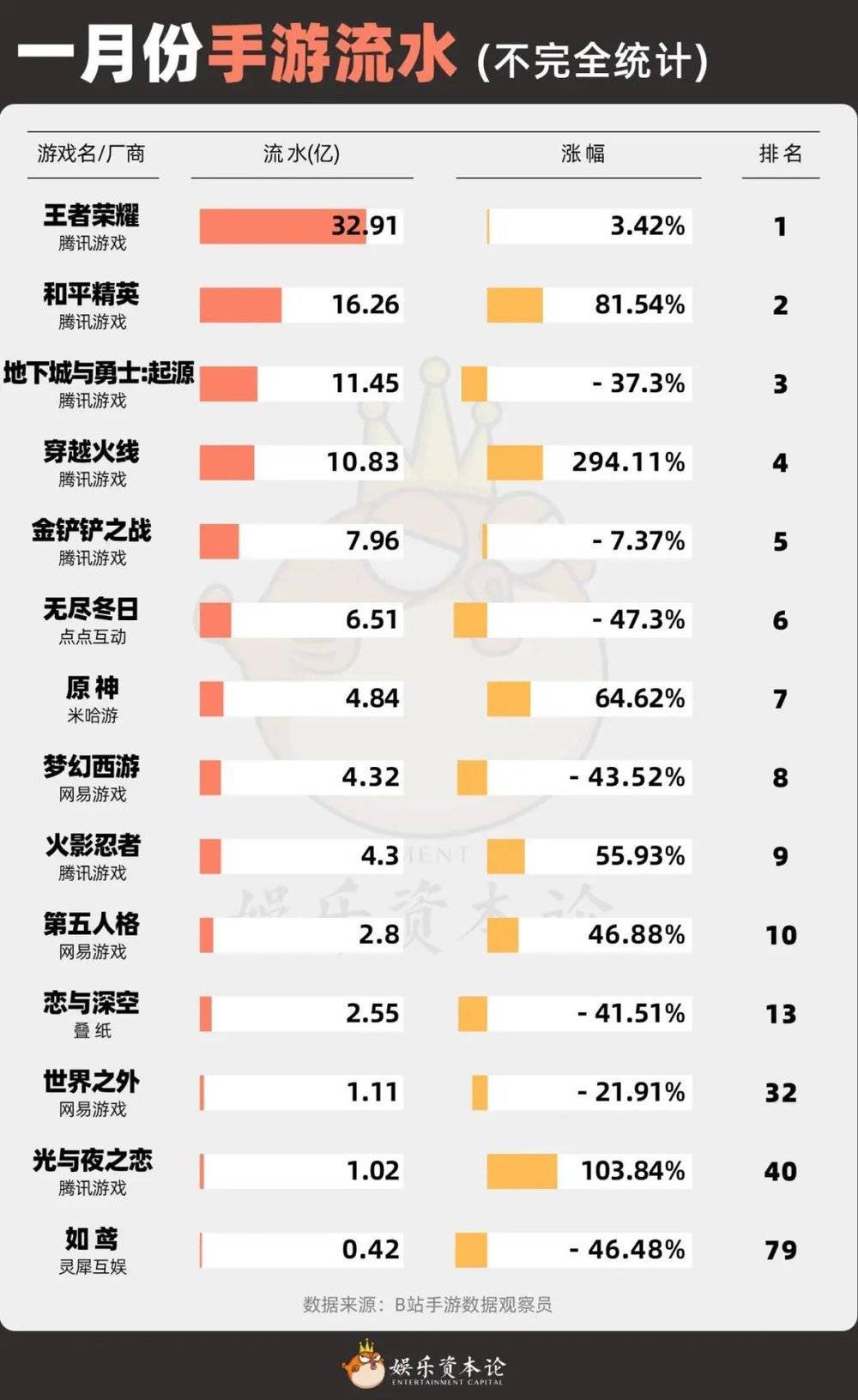当然,1月份最后几天正好赶上春节本就是各大厂商发力的关键节点,对大DAU游戏更是利好,国乙成绩不佳是个必然。娱乐资本论承认,作为圈层属性更重的游戏,确实不能要求国乙直接与《王者》《金铲铲》等掰手腕。