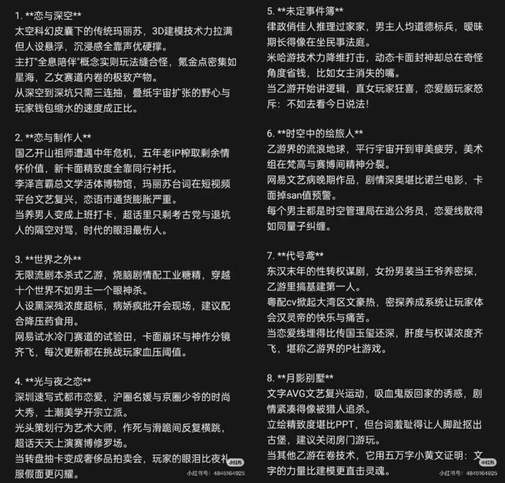乙游也是一样。人设的重复度太高,玩家不免就会互相比较,而且越琢磨越觉得问题多多,继而削弱对产品的忠实度。