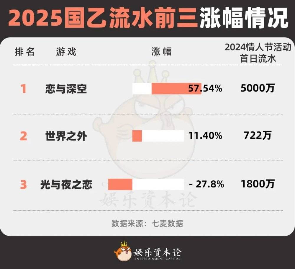 从结果来看,情人节的实际成绩就如开篇我们所说的那样,并不尽如人意,特别是已经四次登顶的《恋与深空》在有新男主加入的情况下,居然没能将辉煌战绩延续下去。