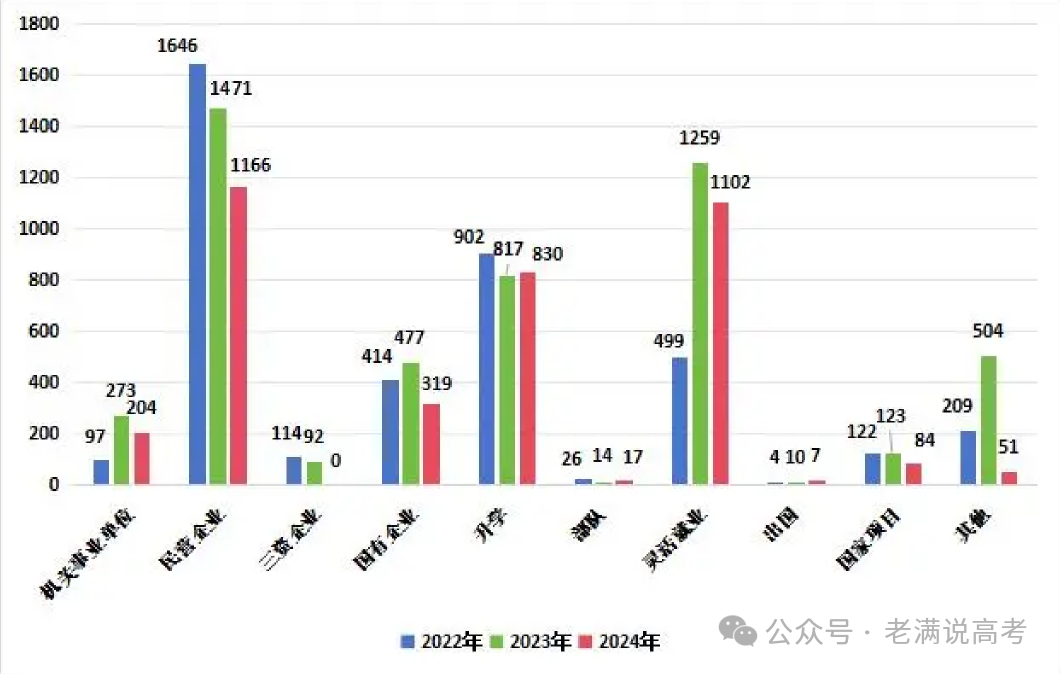 2024 届共有 4340 名本科毕业生,就业 3679 人,本科毕业生就业率 84.77%。毕业生就业类别中,协议和合同就业率 40.02%,灵活就业率 25.39%,自主创业率 0.02%,升学率 19.33%,未就业率 15.23%。