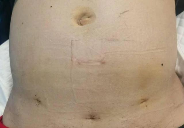 术后第一天李大叔就可以下床了,他和同房病友打趣说自己是来“修肚皮”的,睡一觉醒来,肚子上多了几个创可贴,就轻松得把肚脐眼“修”好了!真不错。