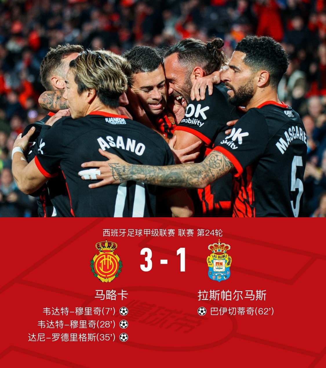 北京时间2月17日西班牙足球甲级联赛 联赛 第24轮,马略卡主场对阵拉斯帕尔马斯。马略卡韦达特-穆里奇梅开二度,达尼-罗德里格斯破门。拉斯帕尔马斯巴伊切蒂奇破门。最终比分马略卡 3-1 拉斯帕尔马斯。