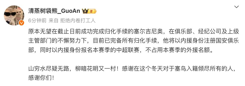 该博主表示:“原本无望在截止日前成功完成归化手续的塞尔吉尼奥,在俱乐部、经纪公司及上级主管部门的不懈努力下,目前已完备所有归化手续,他将以内援身份注册国安俱乐部,同时以内援身份报名本赛季的中超联赛,不占用本赛季的外援名额。