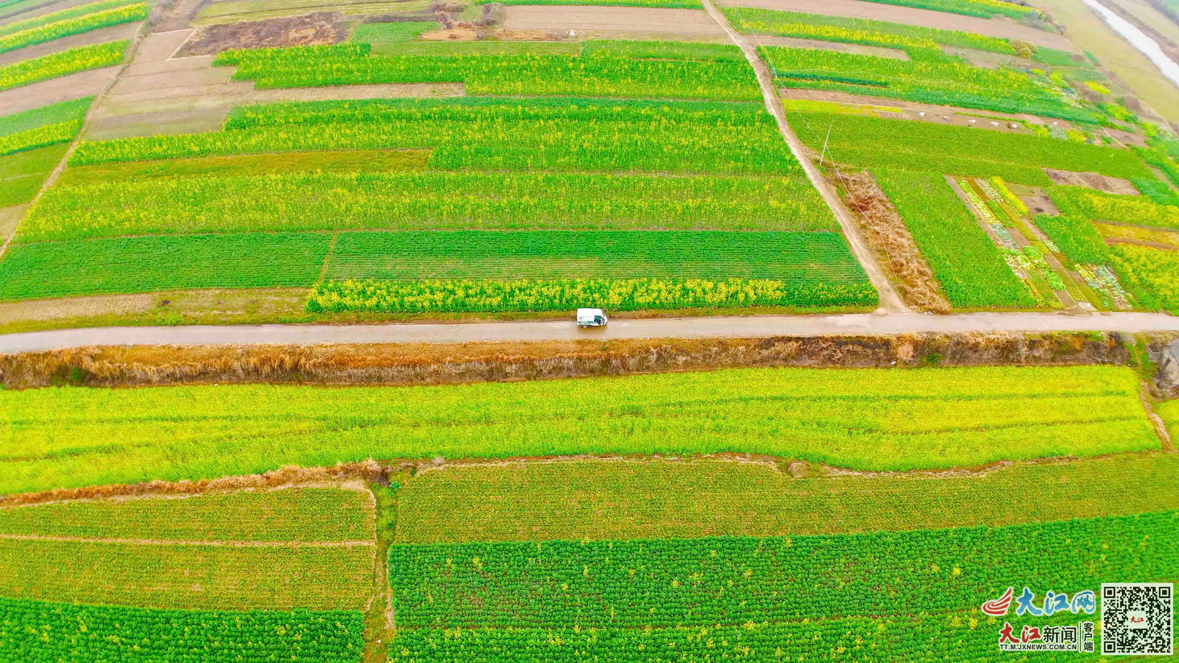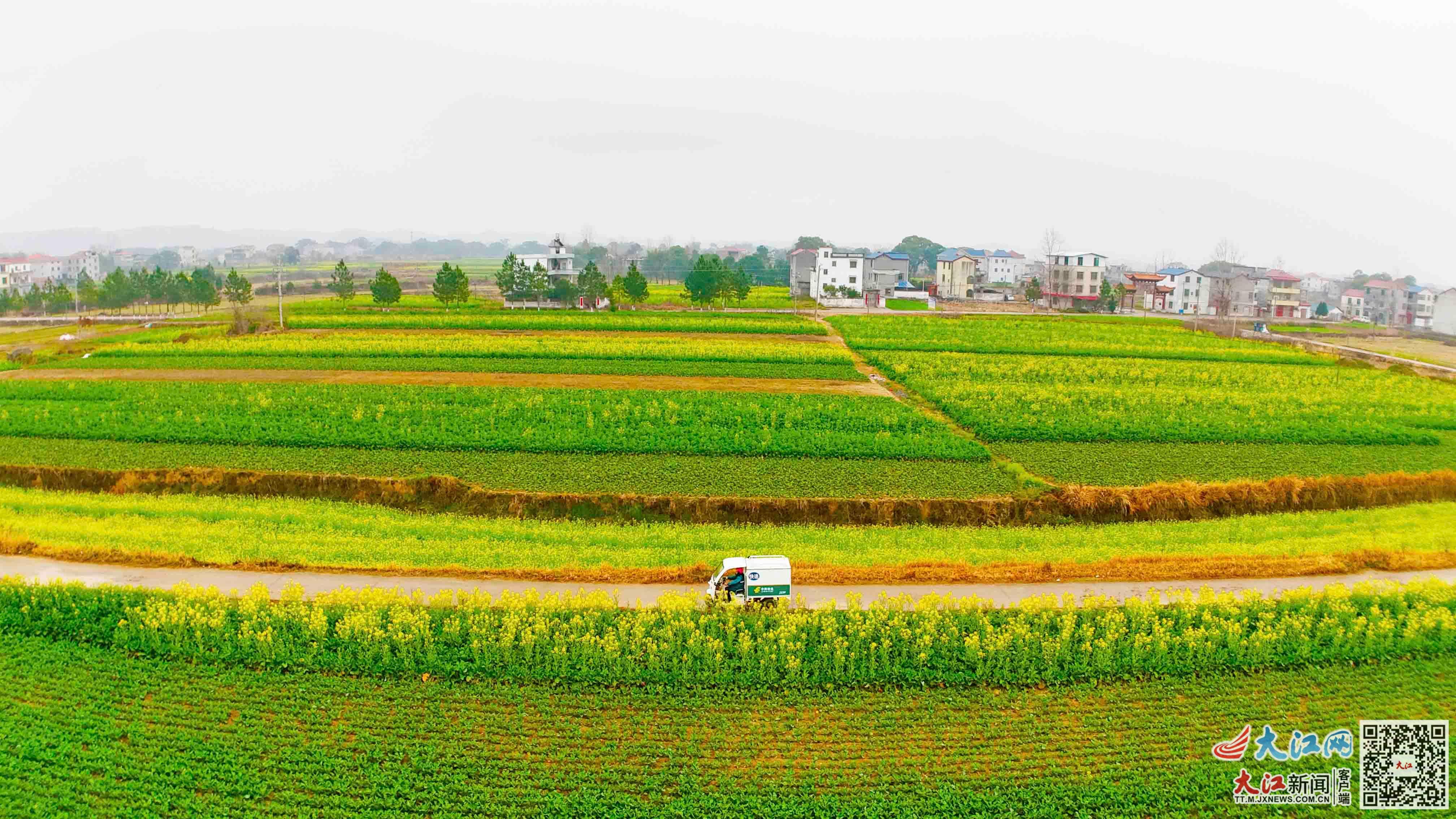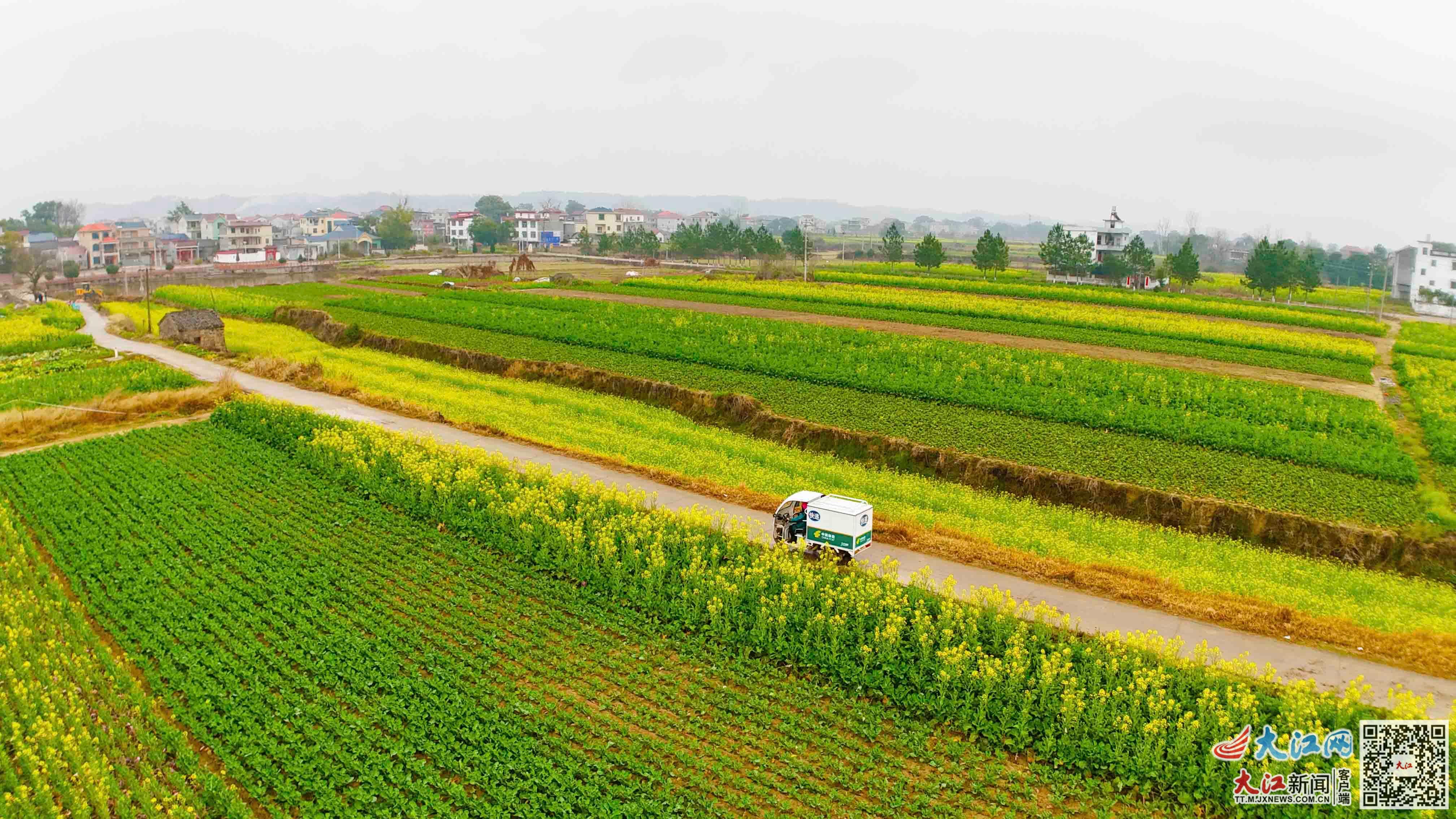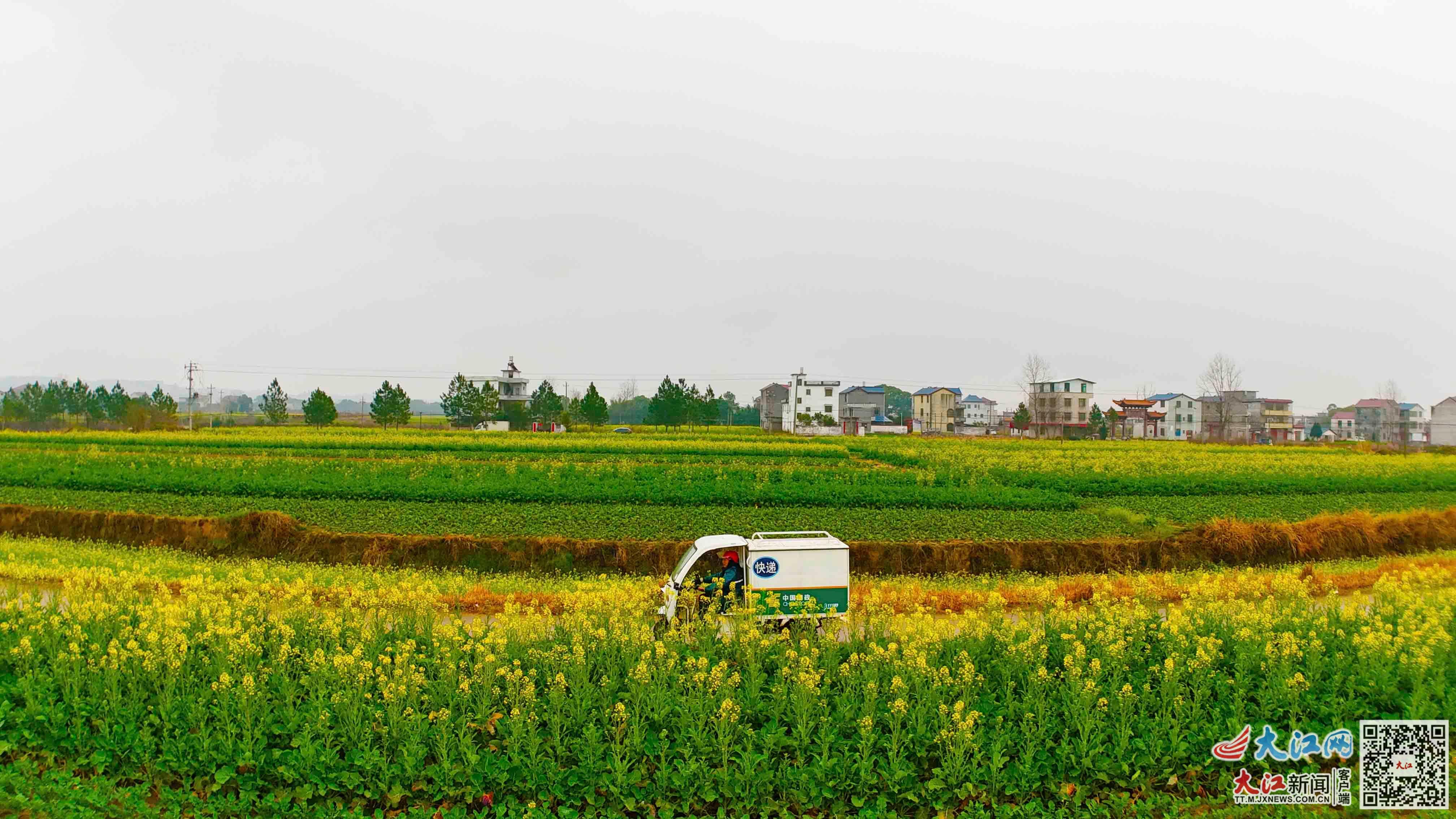 大江网/大江新闻客户端讯 高科峰、全媒体记者陈春伟报道:春回大地,万物生长。近日,位于江西省泰和县万合镇集义村的万亩油菜花竞相绽放。纵横交错的油菜花地,与农房、水泥村道相映成趣,构成一幅美丽的春日画卷。在这片金色花海中,穿梭往来的绿色邮政投递车为田园风光增添了一抹跃动的色彩。