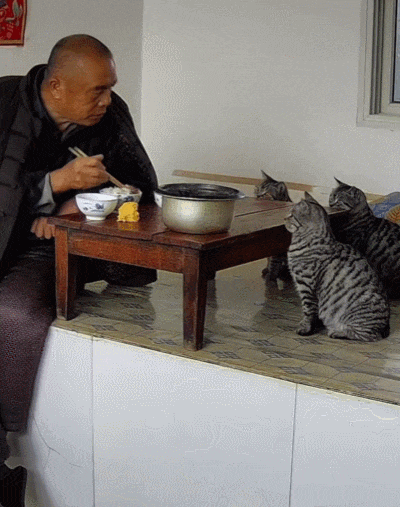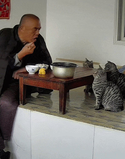 网友@老人与喵 家里的三只大馋猫,只要一看到爷爷准备吃饭,喊都不用喊一声,立马就主动围上去了,目光炯炯的盯着爷爷。