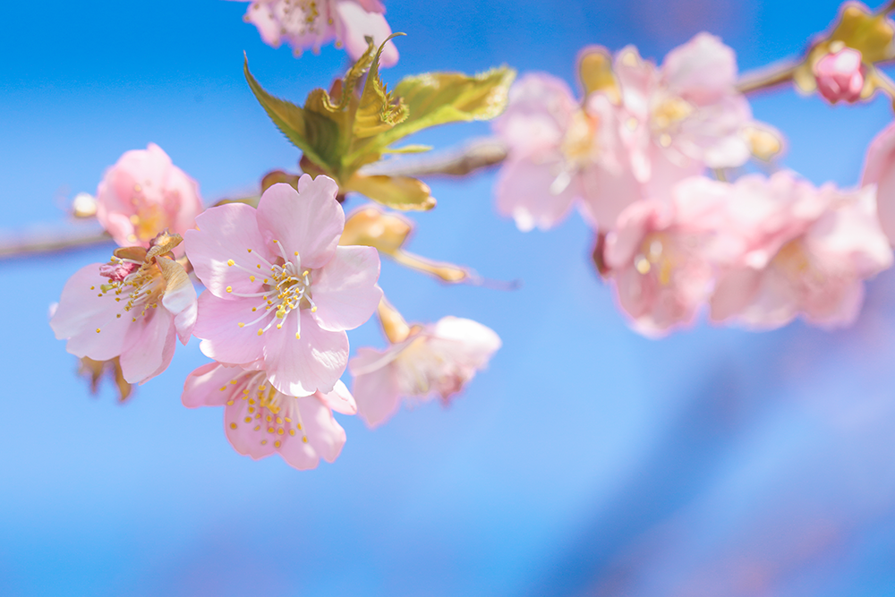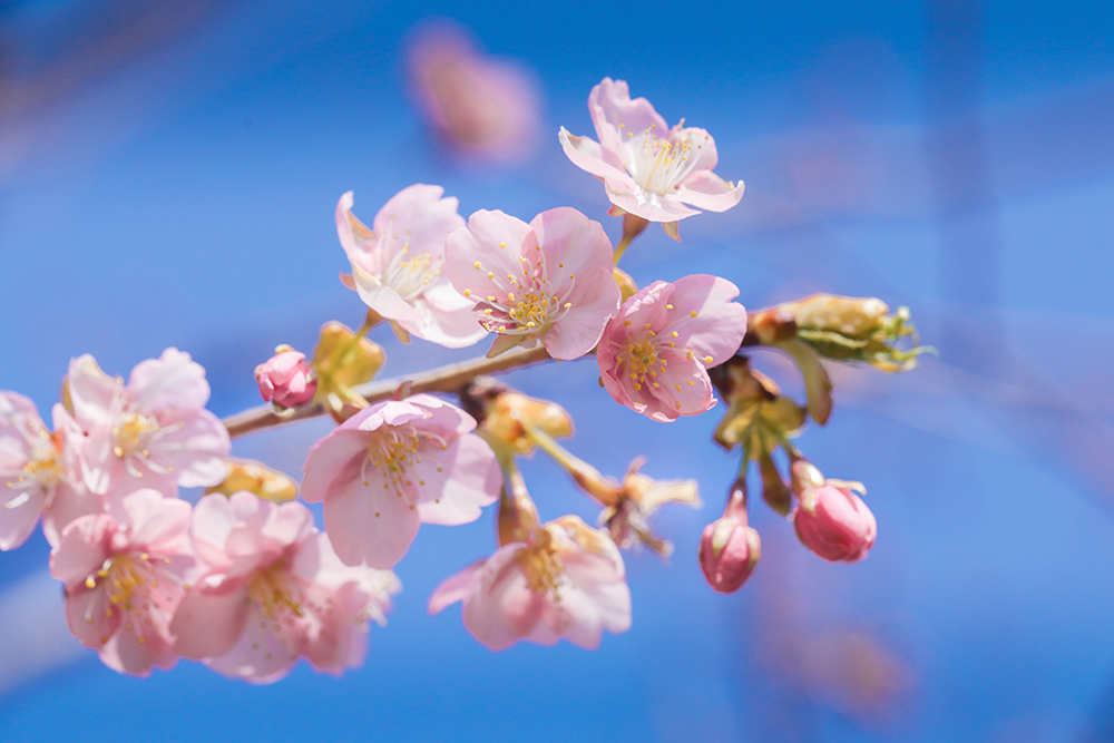 寒樱是辰山樱花园中花期最早的樱花品种,几乎与梅花同期开放,素有“报春樱花”的美称。寒樱为落叶小乔木,树皮紫褐色,常呈黑色。枝条斜向上伸展,树形成瓶状,小枝较粗;花瓣5枚,伞形花序,先叶开放;萼暗紫红色,萼筒筒状钟形,花柱稍低于雄蕊;幼叶红褐色,成叶上面暗绿色,下面淡绿色微泛白,叶面略呈“V”字形。