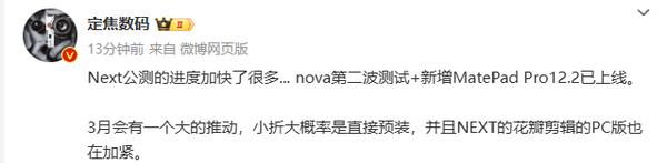 2月17日,有数码博主透露,华为HarmonyOS NEXT的公测进度显著加快。华为nova系列的第二波测试已经开始,并且新增了MatePad Pro 12.2英寸平板的支持。预计在3月份会有一个大的推进,小折叠屏设备很有可能直接预装HarmonyOS NEXT。此外,NEXT版的花瓣剪辑PC版也在加紧开发中。