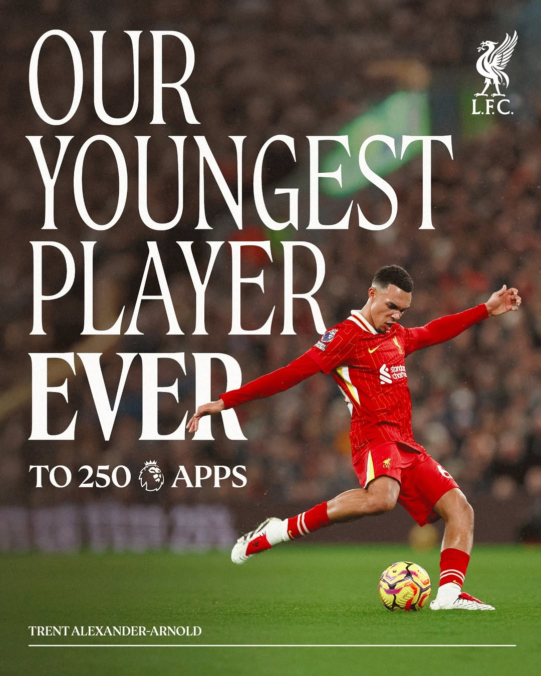 利物浦官方为阿诺德制作个人海报庆祝其创纪录,并配文:星光闪烁只为砖石垒砌成的来时路。恭喜阿诺德成为队史英超达成250出场最年轻的球员。