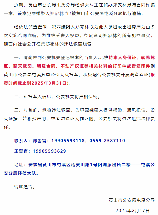 一、请尚未到公安机关登记报案的当事人,尽快持本人身份证、转账凭证、聊天截图、租赁合同、不动产权证等相关材料的打印件或者复印件到黄山市公安局屯溪分局经侦大队报案,积极配合公安机关开展调查取证(报案时间截止到2025年3月31日)。
