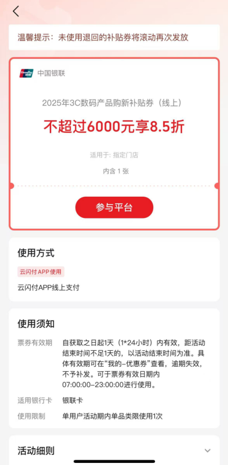 除了领取国家补贴之外,云闪付APP中还有各类商家优惠券、银行的官方满减活动,助力每个追求生活幸福的朋友,把每分钱花成自己想要的模样。