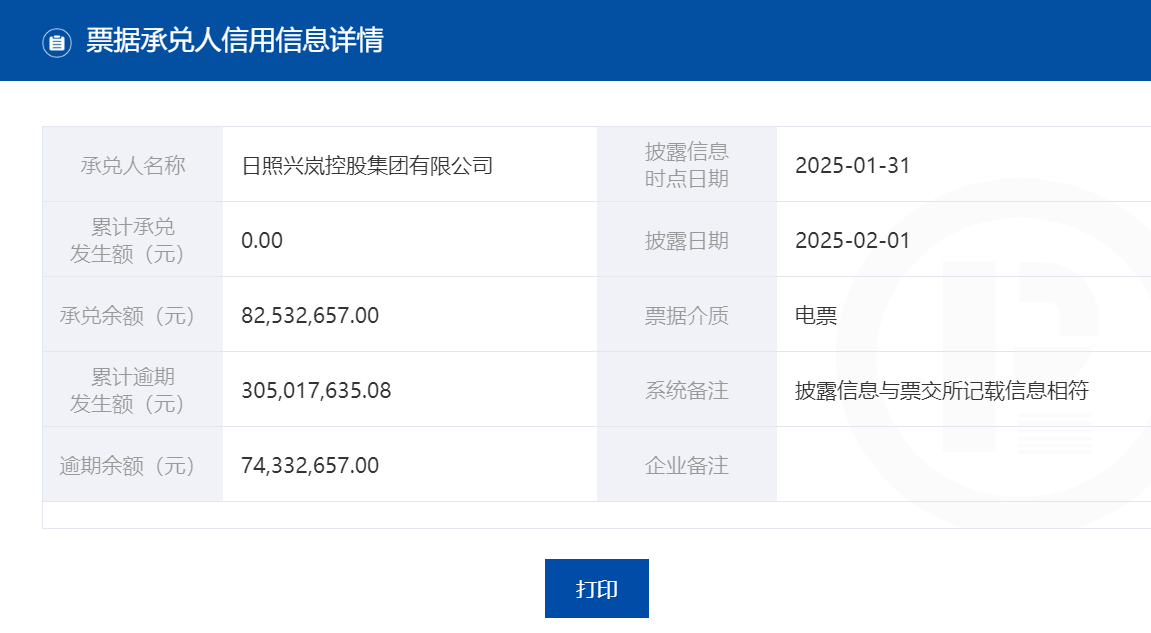 上海票据交易所官网“信息披露平台”栏目中的票据承兑人信用信息详情显示,日照兴岚控股集团有限公司累计逾期发生额305,017,635.08元,逾期余额74,332,657.00元。