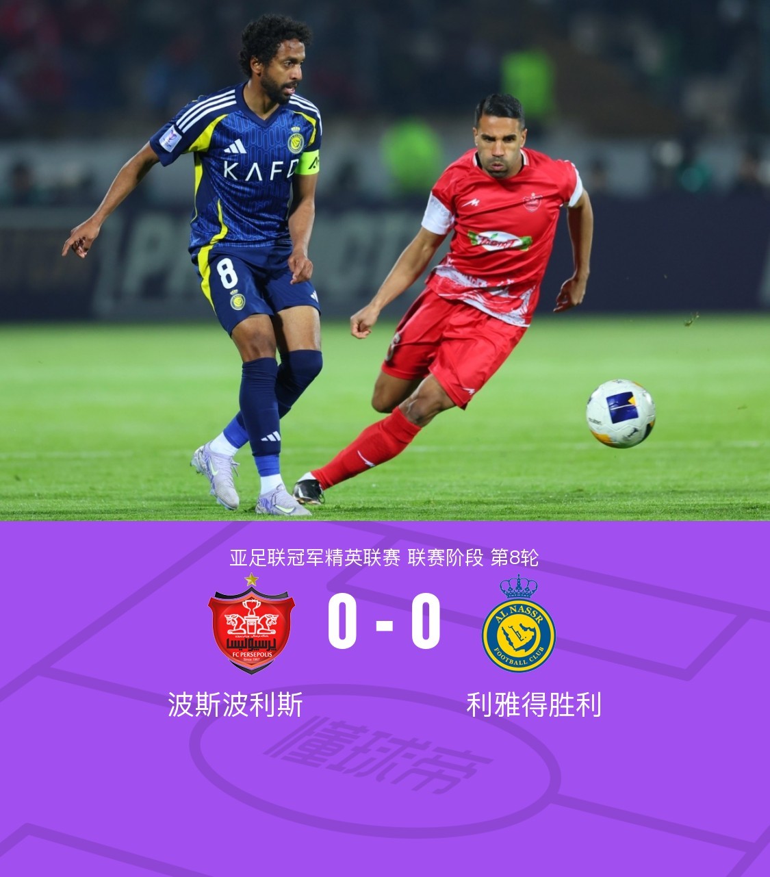 北京时间2月18日亚足联冠军精英联赛 联赛阶段 第8轮,波斯波利斯对阵利雅得胜利。本场比赛C罗、杜兰轮休。上下半场场面平淡,双方机会不多。最终利雅得胜利客场0-0战平波斯波利斯。