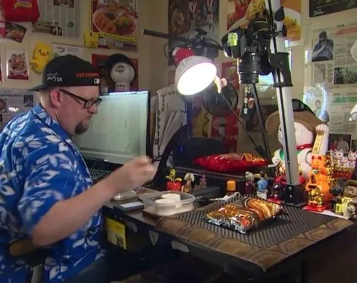 每次开箱一个新口味的泡面,他都会架好相机来拍摄记录。