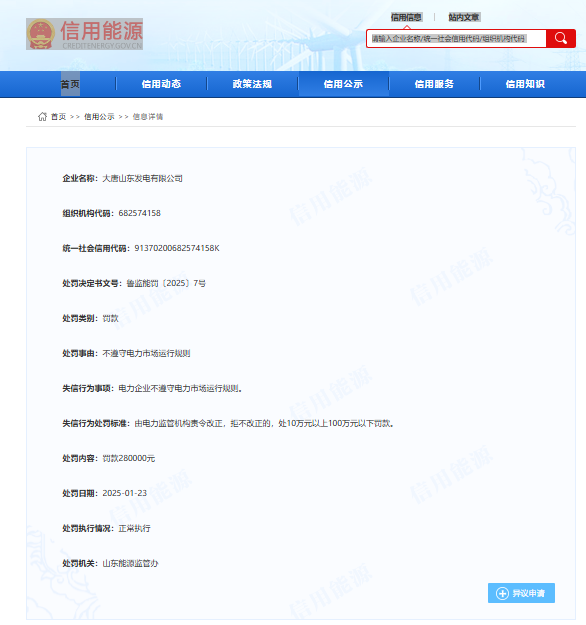 凤凰网山东(报料微博@凤凰网山东)近日从信用能源官方查询获悉,因不遵守电力市场运行规则,大唐山东发电有限公司(以下简称“大唐山东发电”)被处以280000元的罚款。