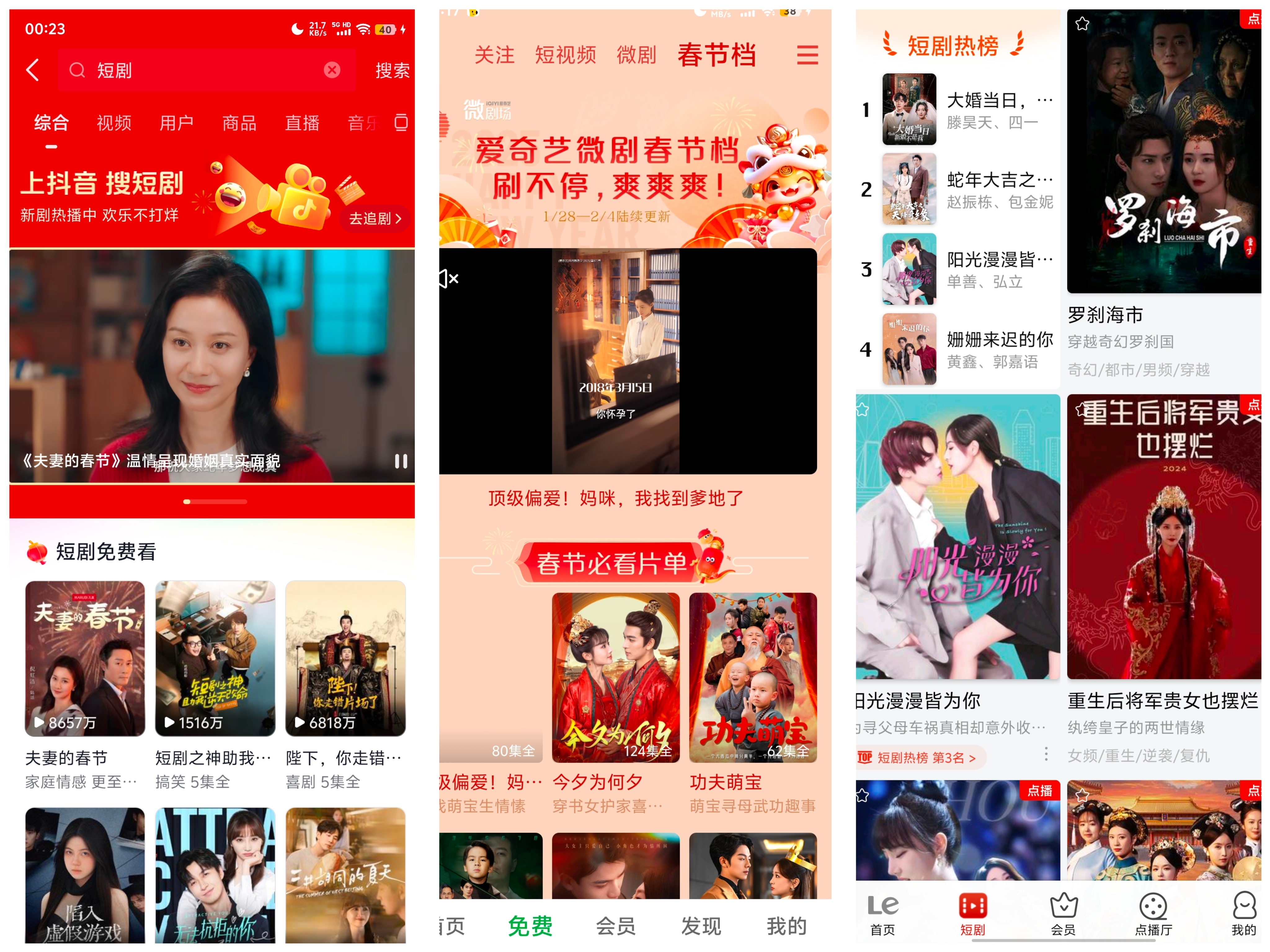 抖音、爱奇艺、乐视的微短剧春节档 图源:各平台截图