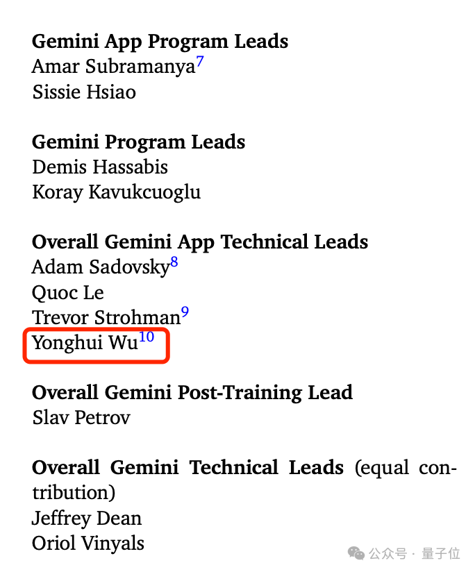 具体到Gemini的相关论文中,吴永辉的名字出现在“Gemini App总体技术负责人”一列。