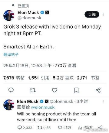 据悉,2月16日,马斯克在社交平台X上发文称,Grok 3大模型将于太平洋时间周一晚上8点(北京时间周二12点)发布,届时将进行现场演示。他表示,这将会是“地球上最聪明的AI”。