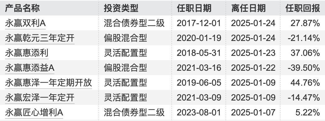 1月7日以来,李永兴陆续卸任永赢匠心增利、永赢宏泽一年定开、永赢惠泽一年定期开放、永赢惠添益、永赢惠添利等产品的基金经理。至此,李永兴旗下已暂无在管公募产品。