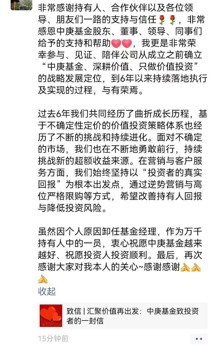 7月,中庚基金的丘栋荣清仓在管产品,卸任之前,旗下5只产品在管总规模为147.08亿元。走的时候他还专门发了朋友圈说是个人原因卸任的。