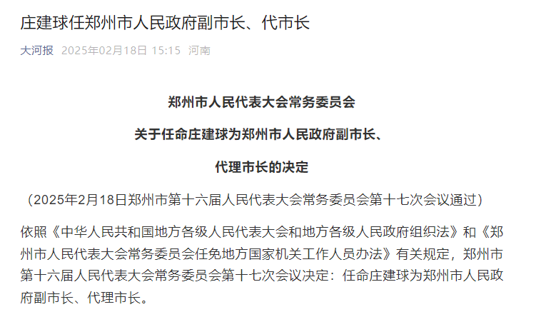依照《中华人民共和国地方各级人民代表大会和地方各级人民政府组织法》和《郑州市人民代表大会常务委员会任免地方国家机关工作人员办法》有关规定,郑州市第十六届人民代表大会常务委员会第十七次会议决定:任命庄建球为郑州市人民政府副市长、代理市长。