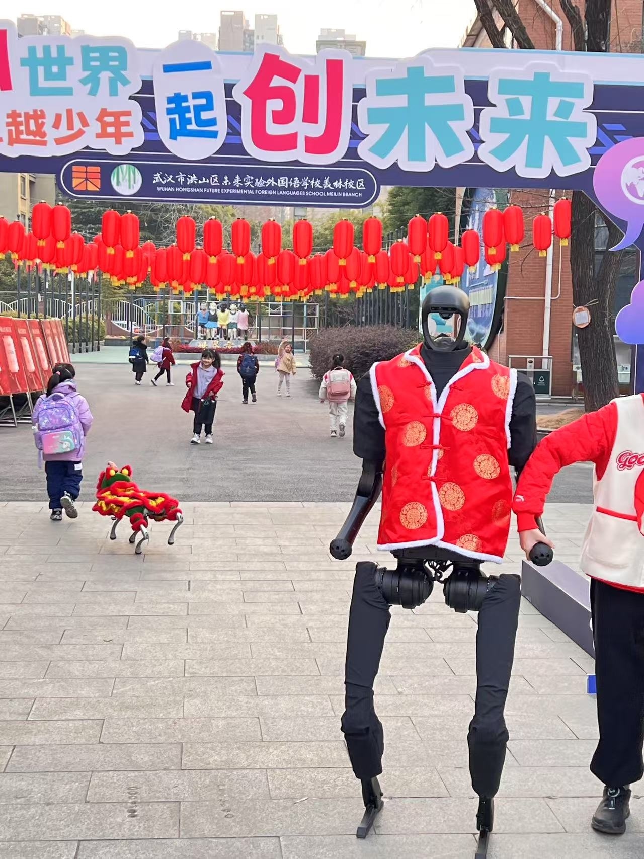 2月13日,在武汉市洪山区未来实验外国语学校美林校区,身着华丽舞狮套装的机器狗与春晚同款机器人组成“科技迎宾团”,迎接学生开学。在武汉经开外国语学校的开学典礼上,学生化身“AI达人”展示科技小发明,还有学生现场利用DeepSeek创作英语互动情景剧脚本。