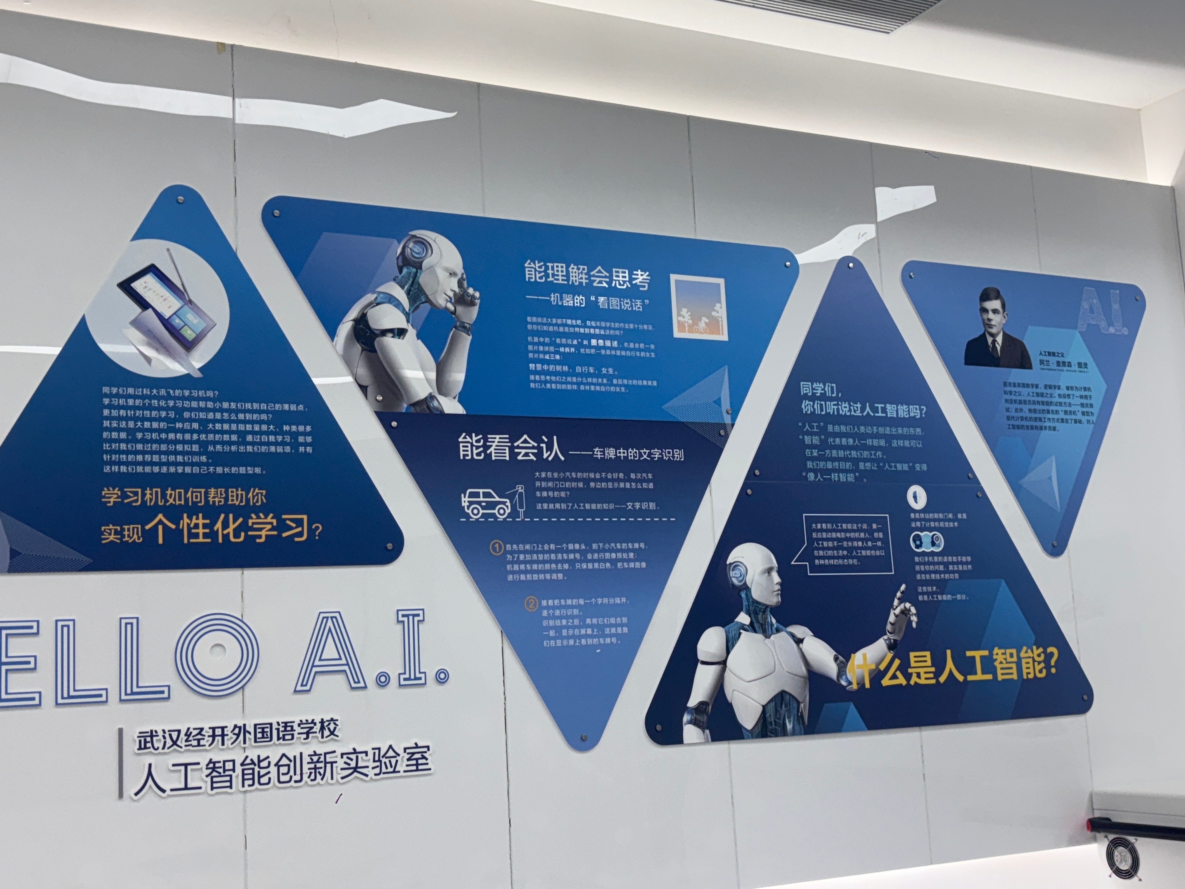武汉经开外国语学校德育主任张德卿介绍,目前学校建设了四个AI智慧教室,还有多个VR、航模的专业功能教室。同时在学校的“第二课堂”中单设了AI智慧课程的板块。在每年的11月份,学校还会举办科技节,号召学生们展示发明成果。