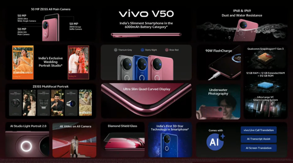 此外,vivo V50还具备双立体声扬声器、AI Superlink、AI Eraser 2.0、AI Transcript assist、AI屏幕翻译、圆形搜索等特色功能。所有摄像头均支持4K视频录制,还具备水下摄影、AI Studio Light人像2.0、印度专属婚礼人像工作室等拍摄模式。同时,该手机还拥有IP68&IP69防水防尘等级、Live照片、4年电池耐用性等实用功能。