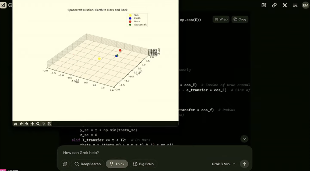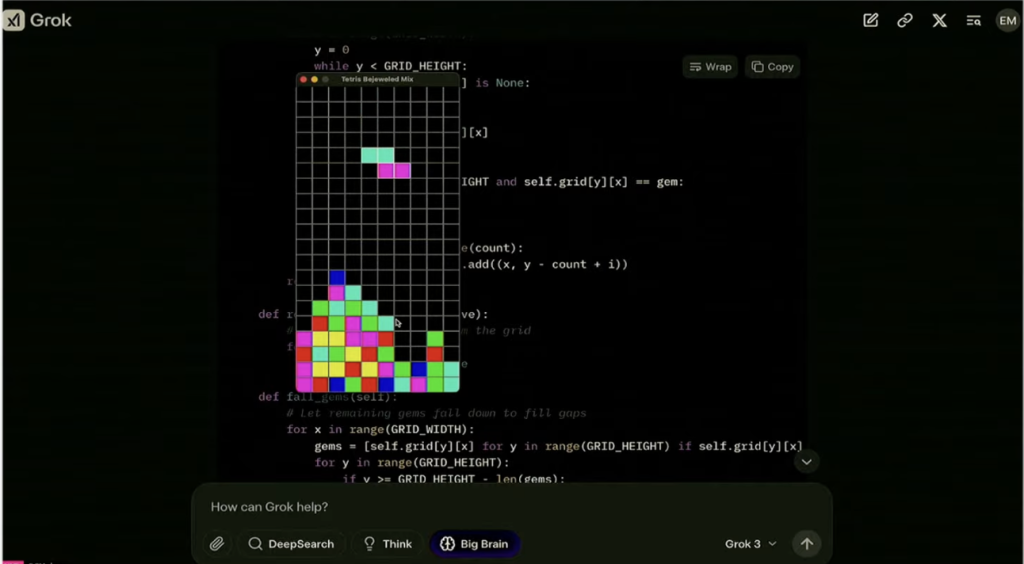 现场,马斯克和工程师们演示了Grok 3的多种能力。在演示中,Grok 3为太空发射生成动画3D,以及开发了一款将俄罗斯方块和宝石迷阵结合的游戏。