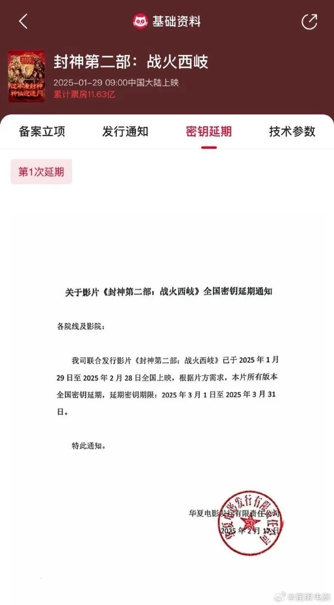 我司联合发行影片《封神第二部:战火西岐》已于2025年1月29日至2025年2月28日全国上映,根据片方需求,本片所有版本全国密钥延期,延期密钥期限:2025年3月1日至2025年3月31日。
